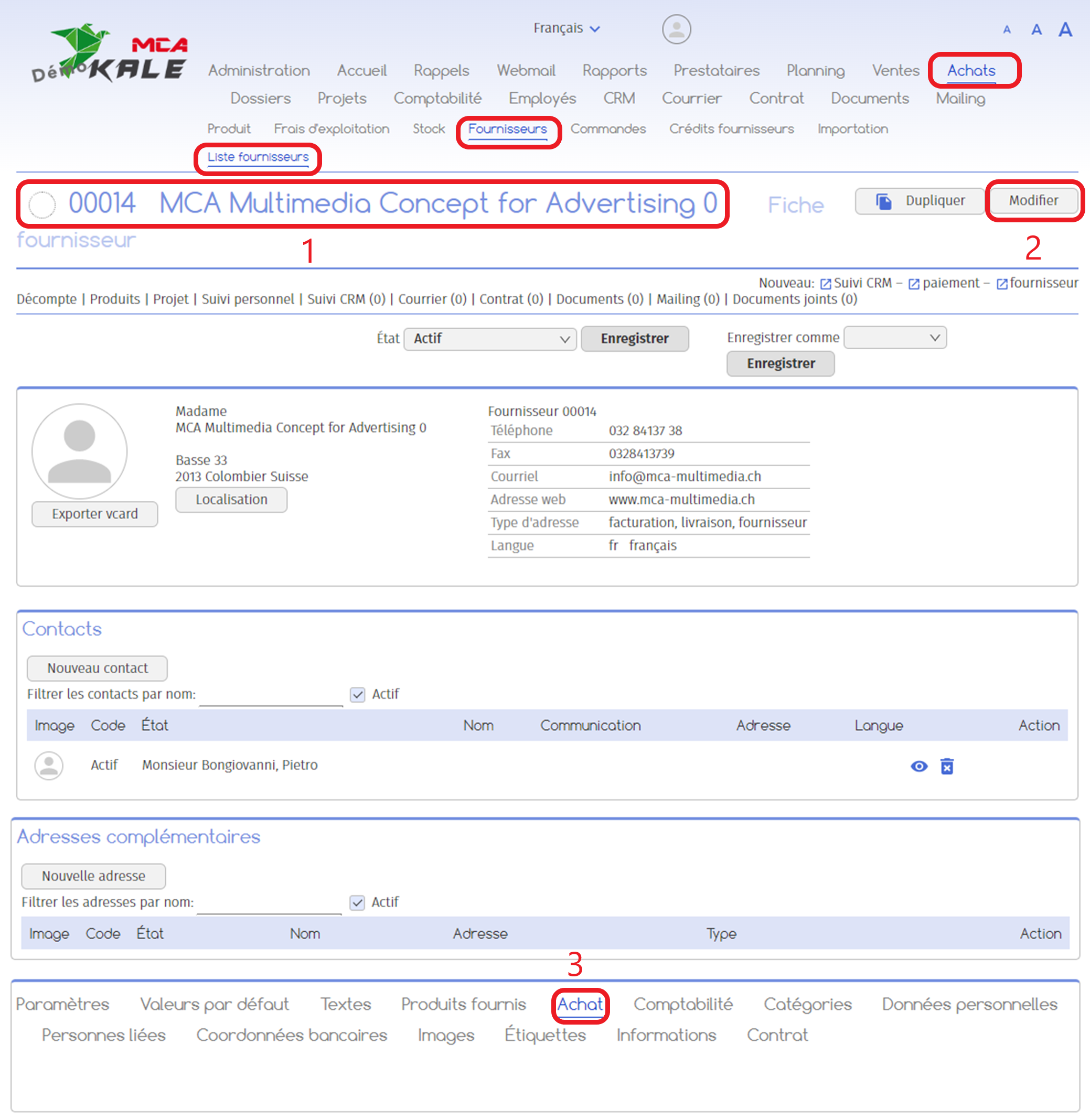 1. Nous sommes sur la fiche fournisseur de « MCA Multimedia Concept for Advertising 0 » ;