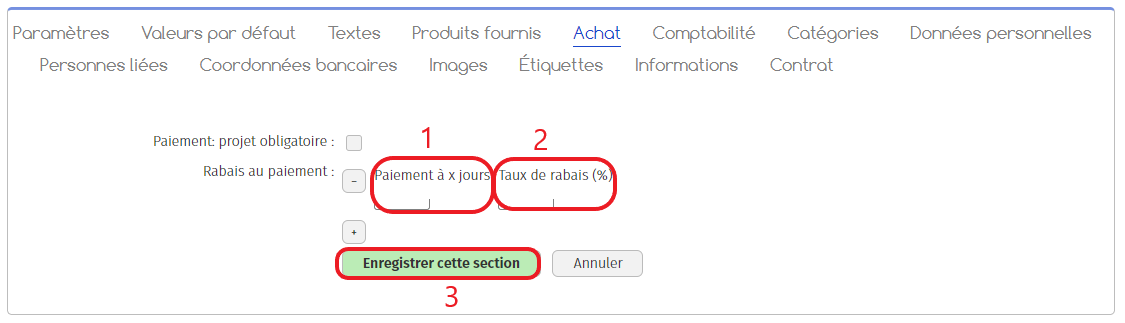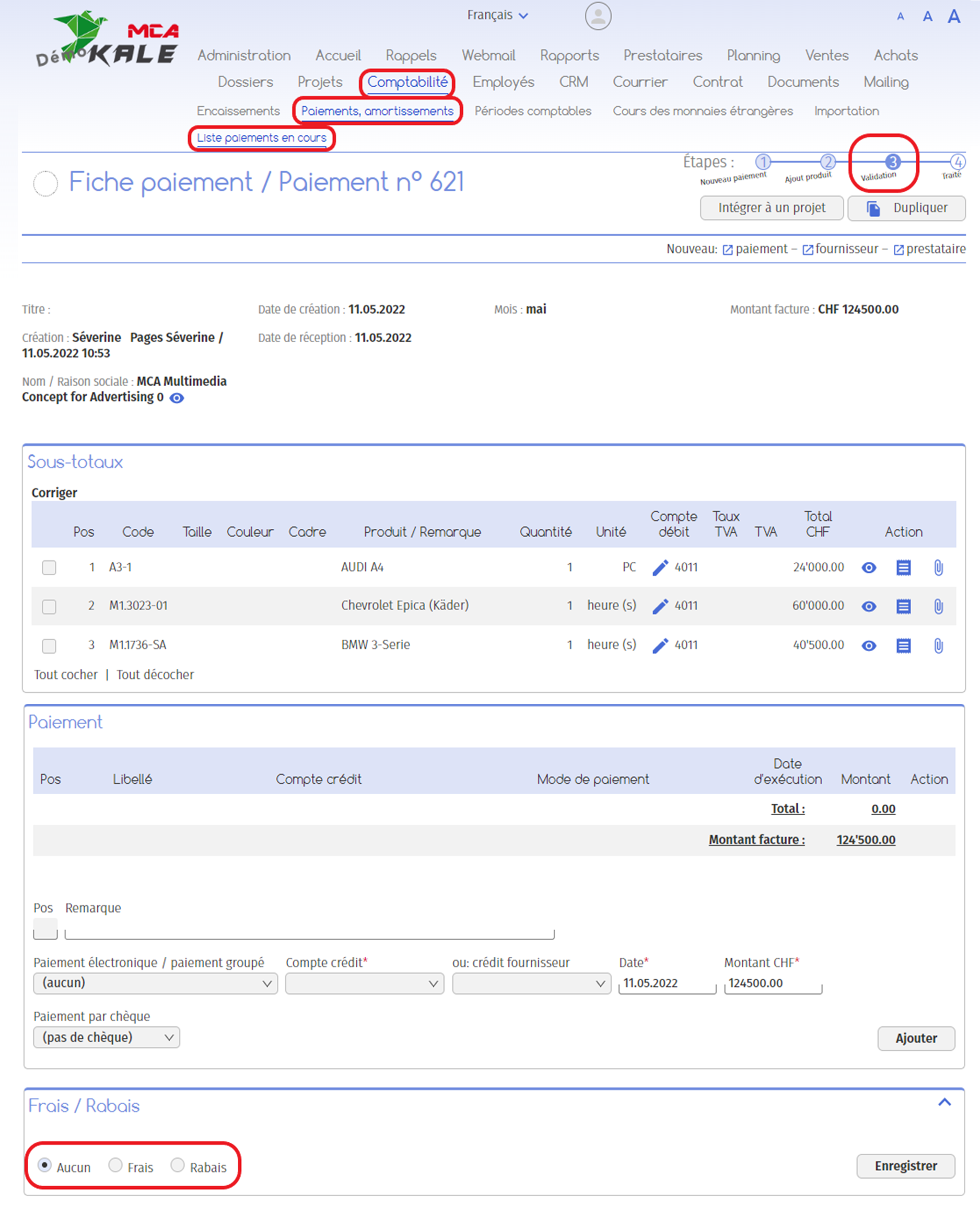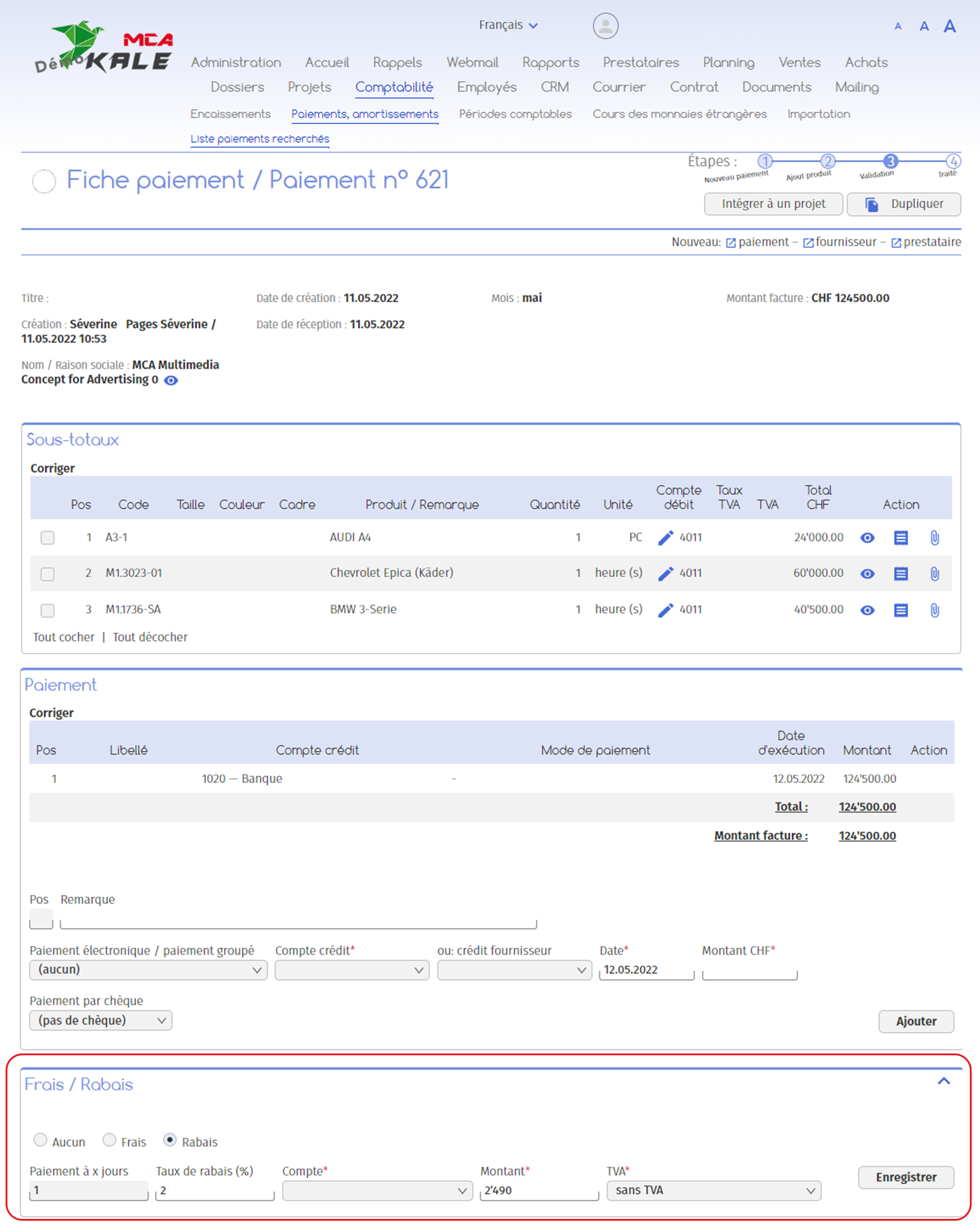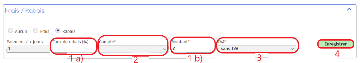 La section « Rabais » est complétée automatiquement. Vous devez encore ajouter un compte (3900 – Escomptes) et la TVA si nécessaire. Finalement, cliquez sur « Enregistrer », puis continuez votre paiement.