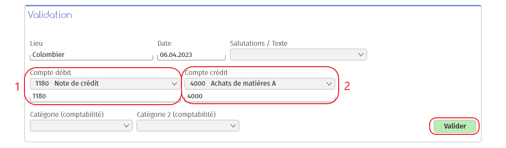 2. Choisissez un compte crédit. Selon votre plan comptable, il s’agira du compte « 4000 Achats de matières A » ;
