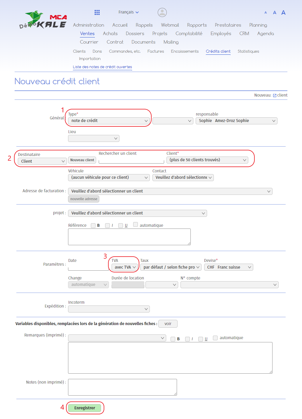 2. Choisissez le client concerné. Dans le cas d’une note de crédit fournisseur, vous choisirez ici le fournisseur concerné ;