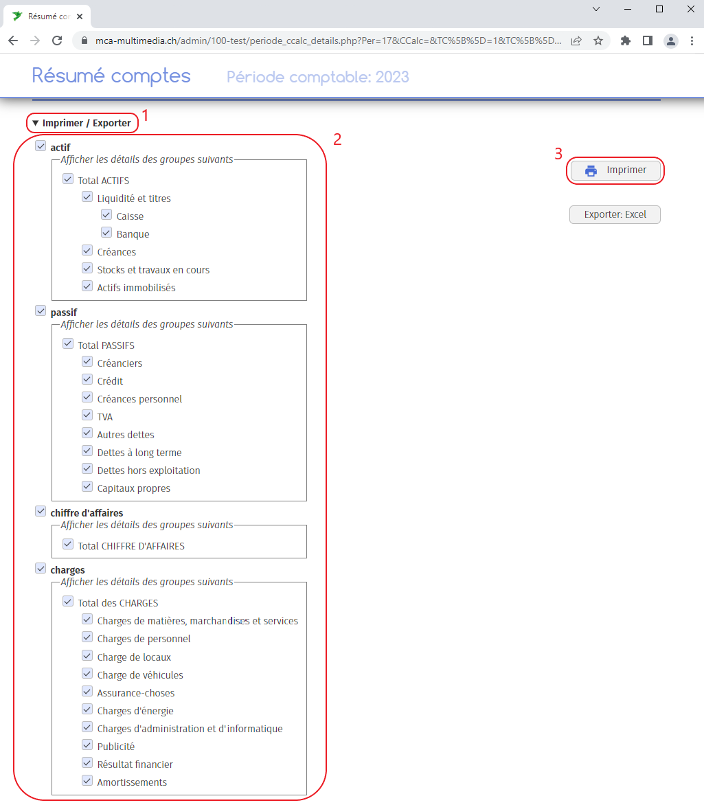 2. Vous pouvez ici encore décider quels groupes de comptes inclure dans l’impression. Sélectionnez les éléments souhaités ;