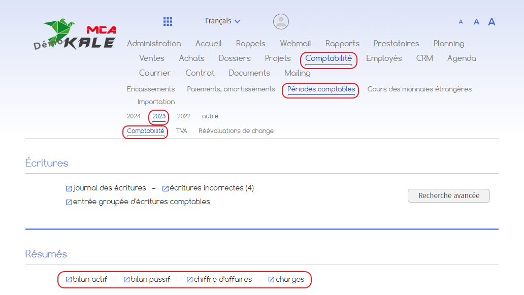 Allez dans « Comptabilité », puis « Périodes comptables », puis « année en cours », puis « Comptabilité ».