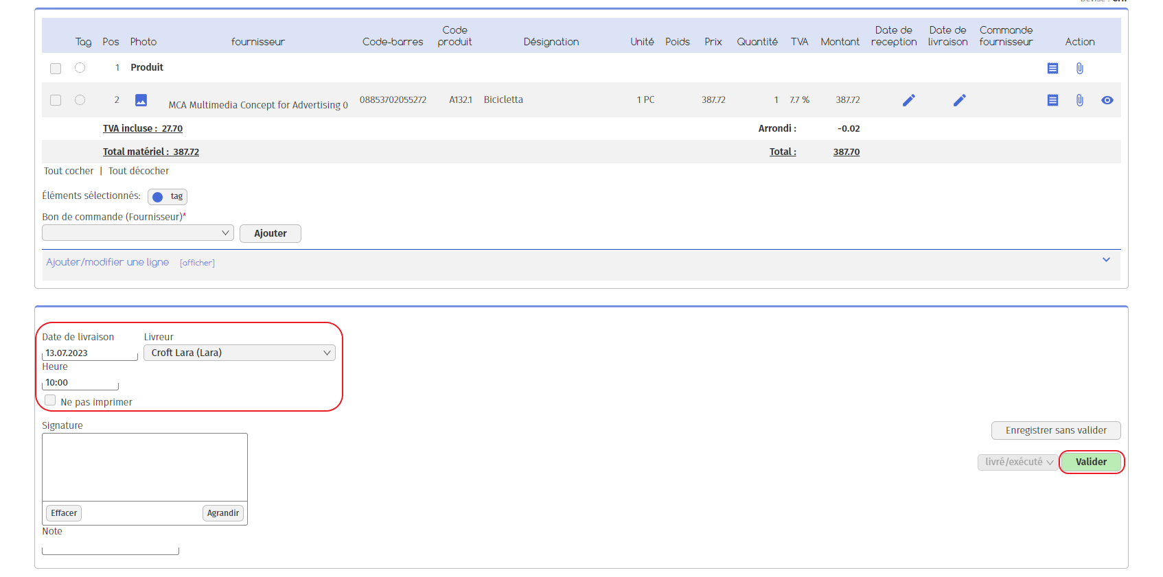 8.   Le bouton « Valider » vous permet de valider le bon : il passera alors du statut « ouvert » à « à livrer/exécuter ».