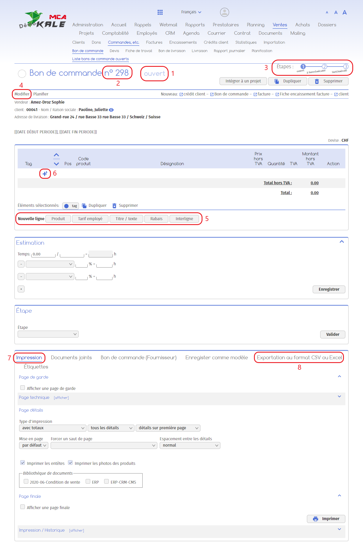 7.   Après avoir ajouté toutes les lignes, vous pouvez imprimer le bon de commande ;